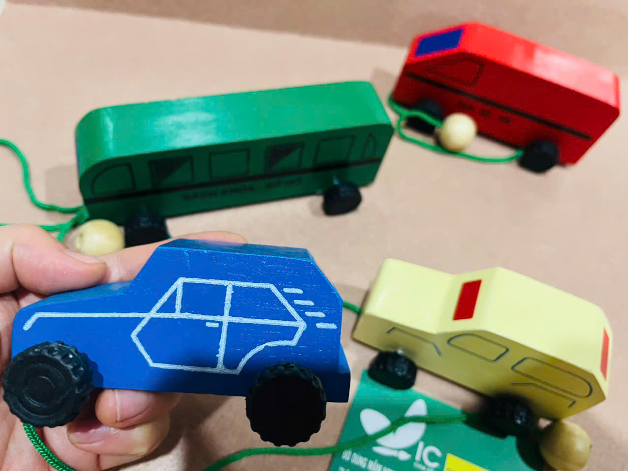 Bánh xe linh hoạt, dây kéo có hạt gỗ giúp bé dễ cầm nắm.