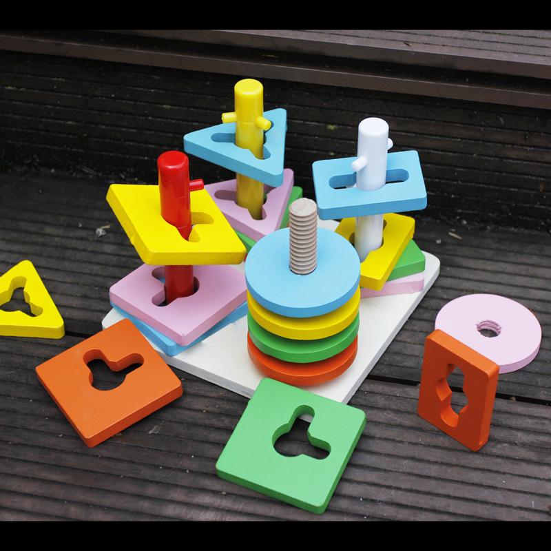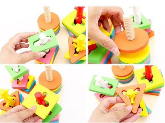 ✔️ Gồm 4 cột gỗ + 20 miếng hình khối (tròn, tam giác, vuông, chữ nhật, thập giá...)